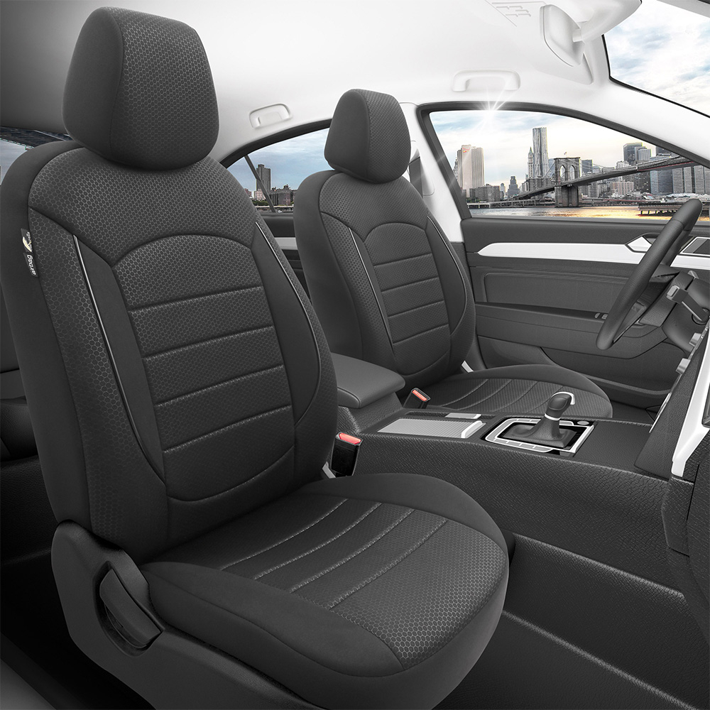 Huse din material textil dublu laminat similar cu tapiteriile originale, cu insertii de piele ecologica si ambele fete dublate cu burete (grosime 5mm)